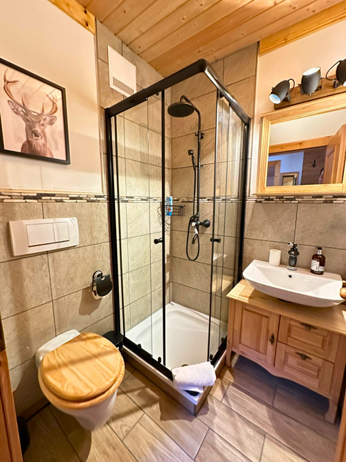 A small, cozy bathroom with walk-in shower and underfloor heating.